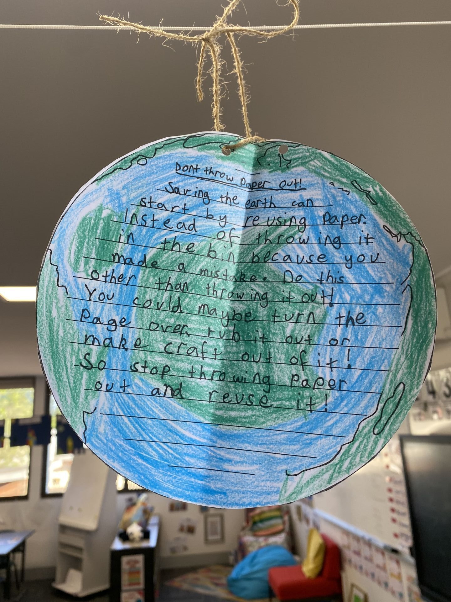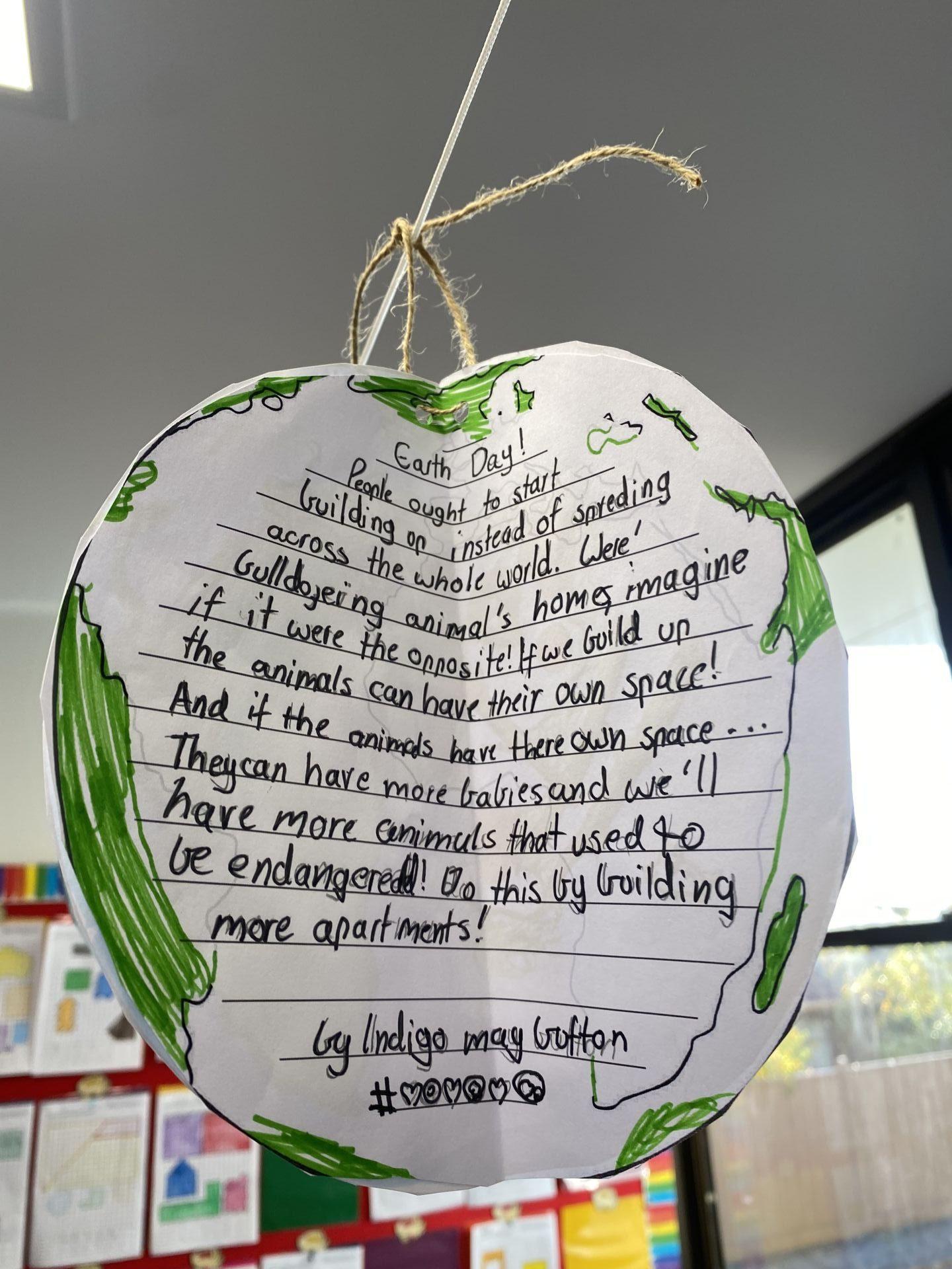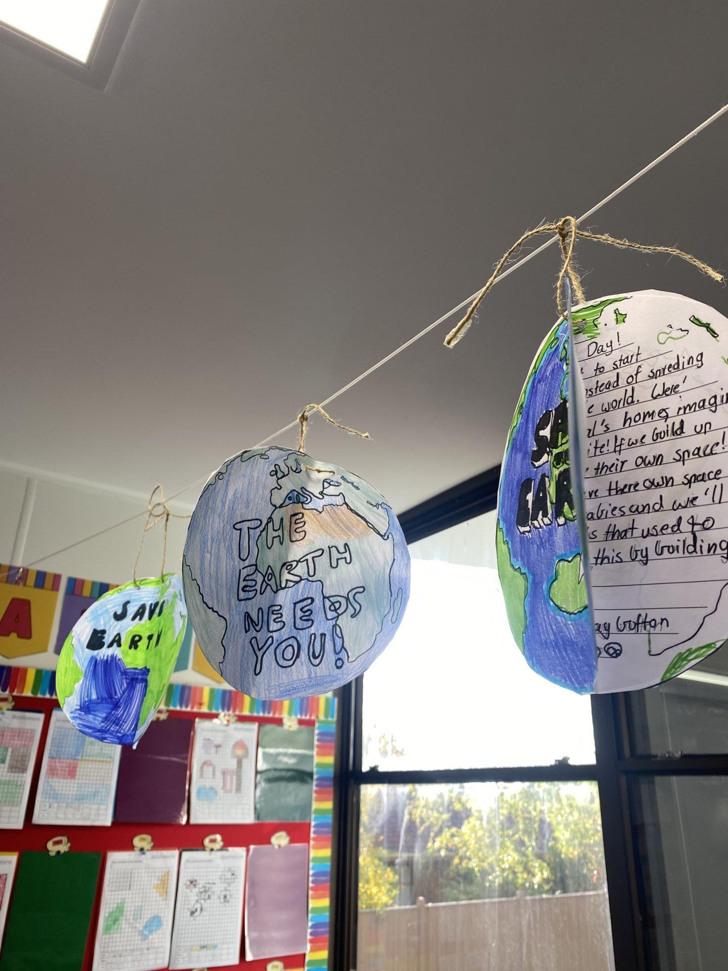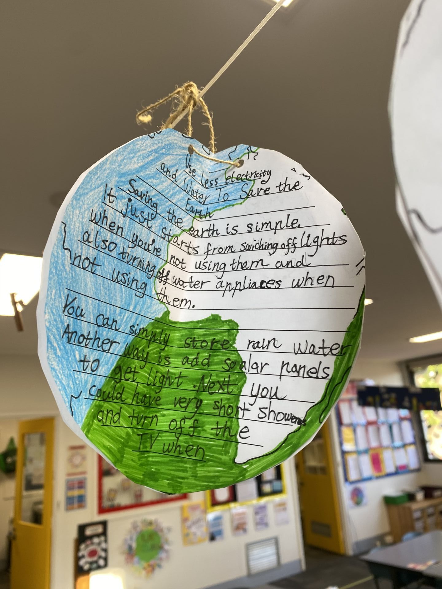 In Year 4, students read and learnt about Earth Day and discussed ways they can help care for the environment. Each student chose one action they can take, such as turning off lights when leaving a room or reusing paper. In 4F, students then created a display to share their personal goal and how they can help make a difference.