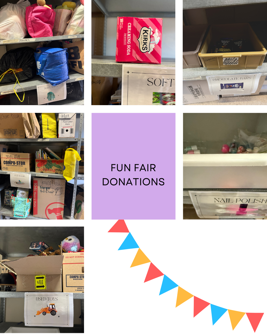 This past fortnight, we have gotten a lot of donations of stuffed toys and books. Keep them coming! We haven't had many donations of nail polish, wine, toys, soft drink or chocolate. Please no donations of cookies, chips, etc. Have a look at our Fun Fair donation closet!